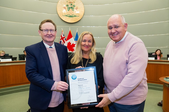 Markham Mayor Frank Scarpitti (right) and CAO Andy Taylor (left) were presented with the ISO 37120 Platinum-level certification by Dr. Patricia McCarney during an official ceremony at City Council on February 28, 2024.